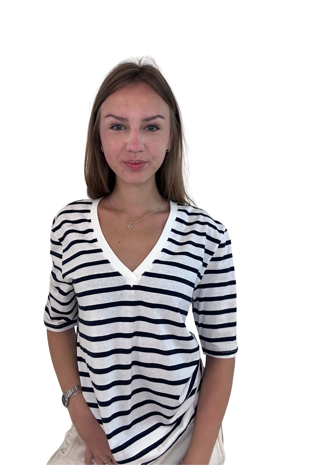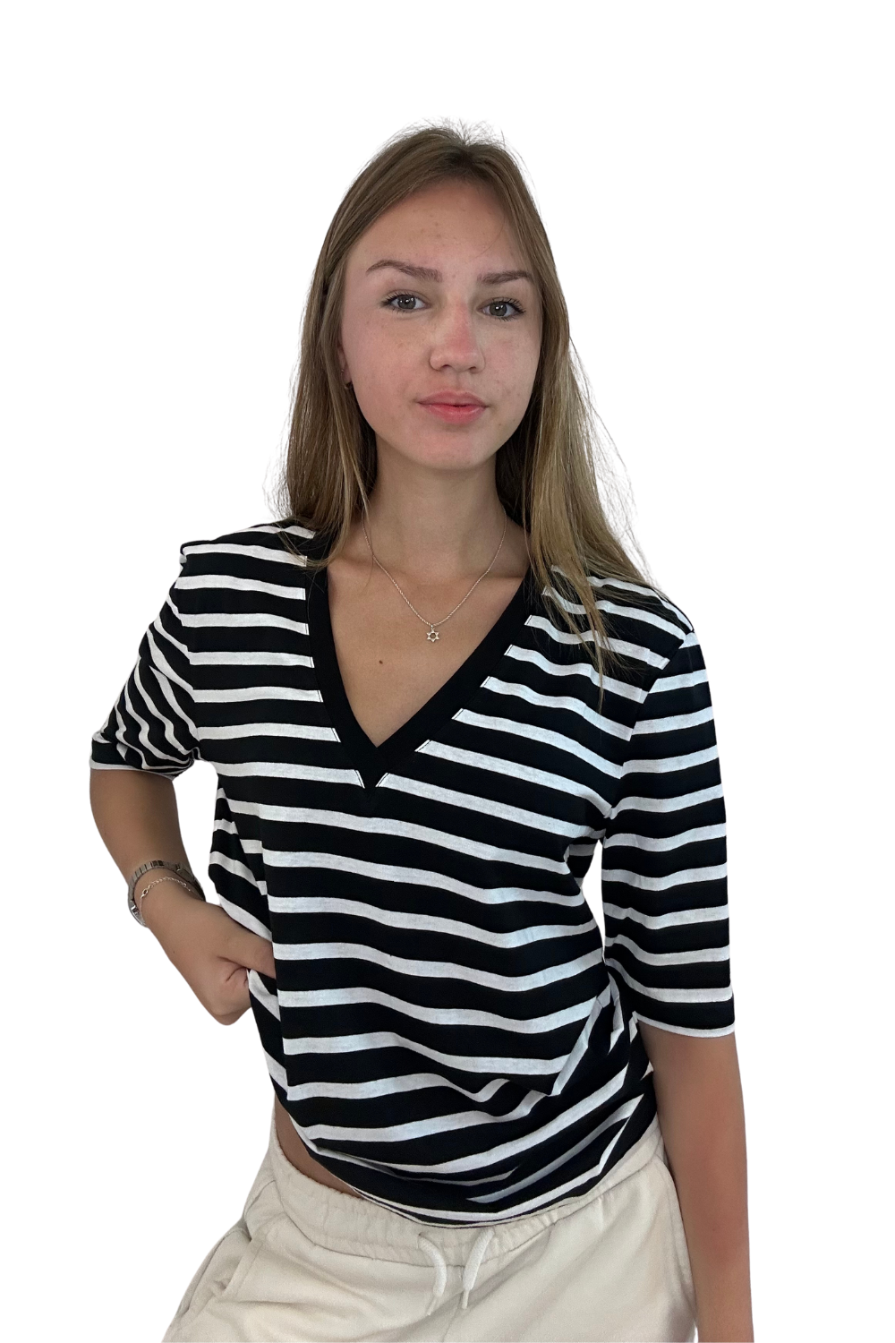 חולצת פסים וי תפר שרוול מרפק