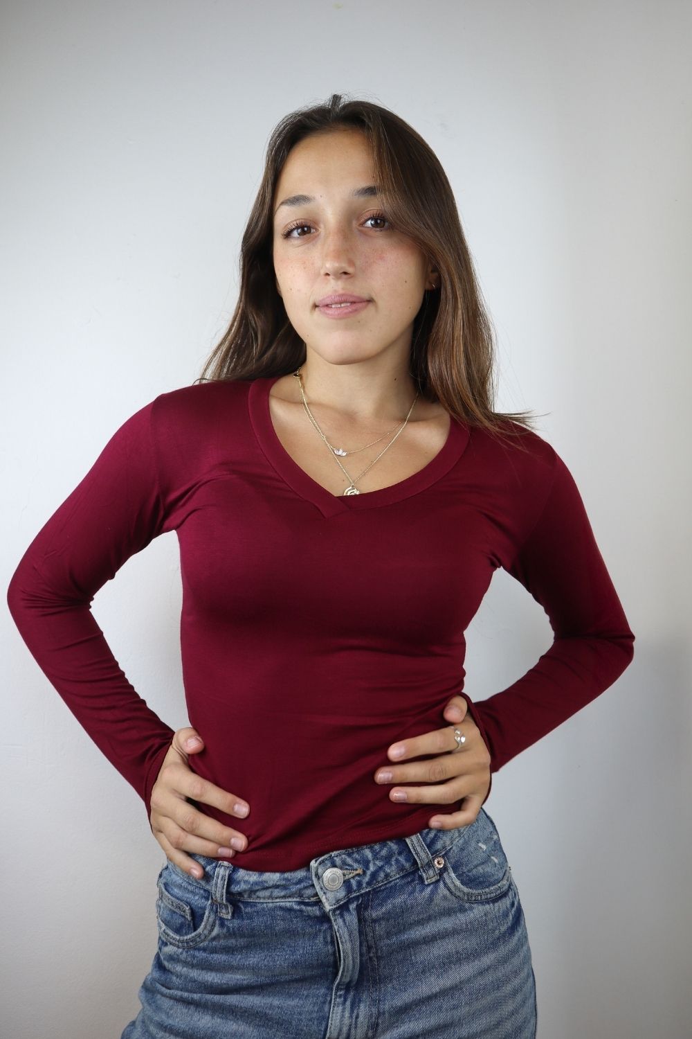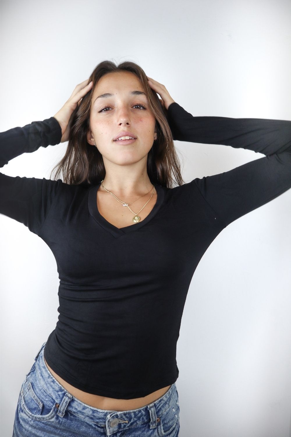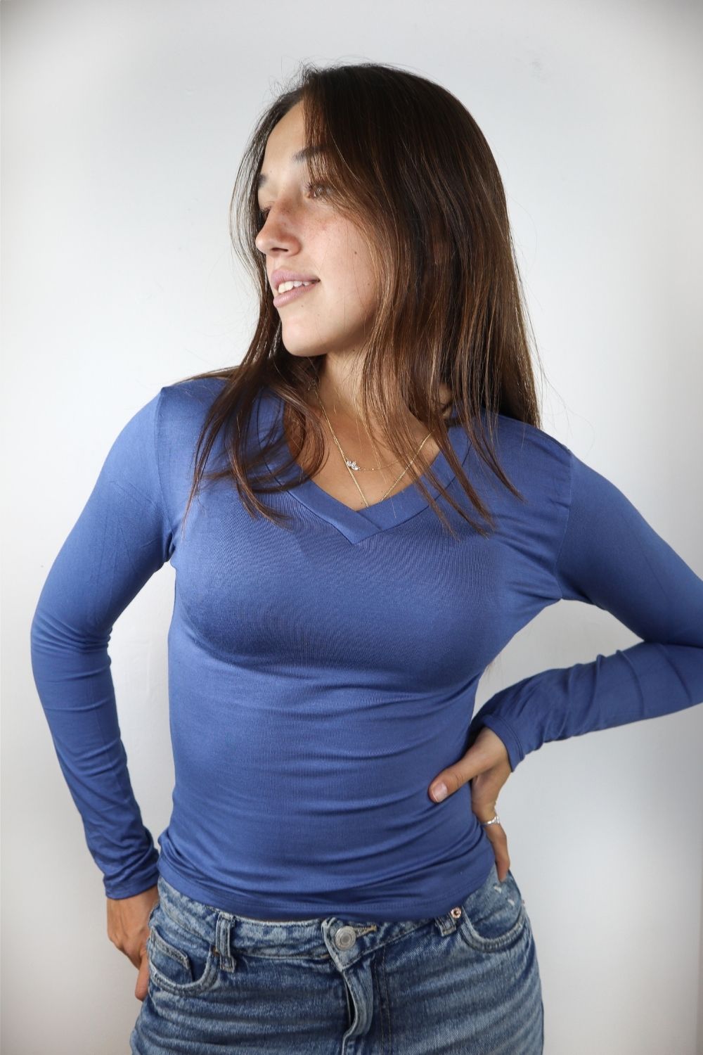 חולצת דגם וי תפר שרוול ארוך - קצרה במותן