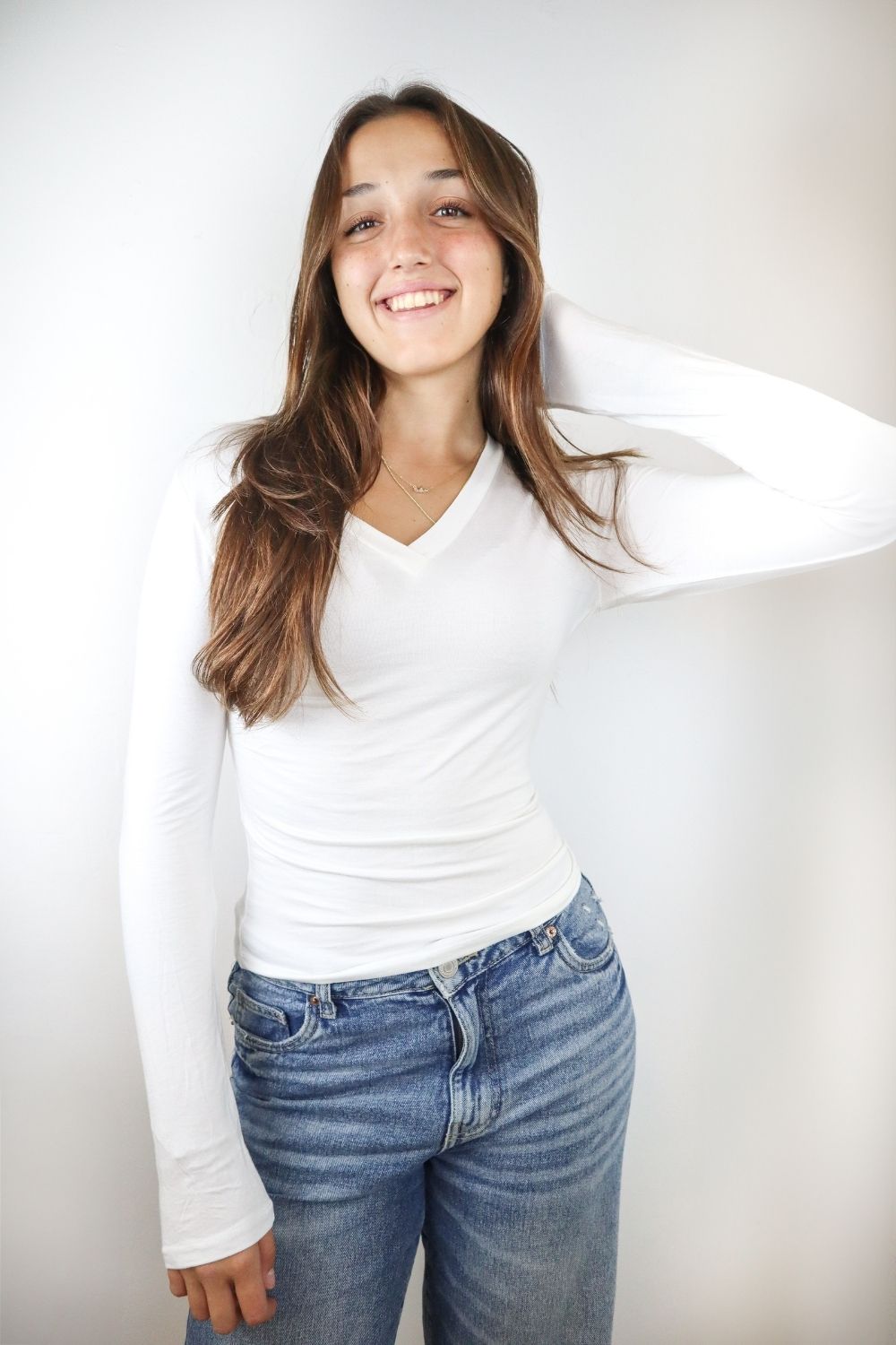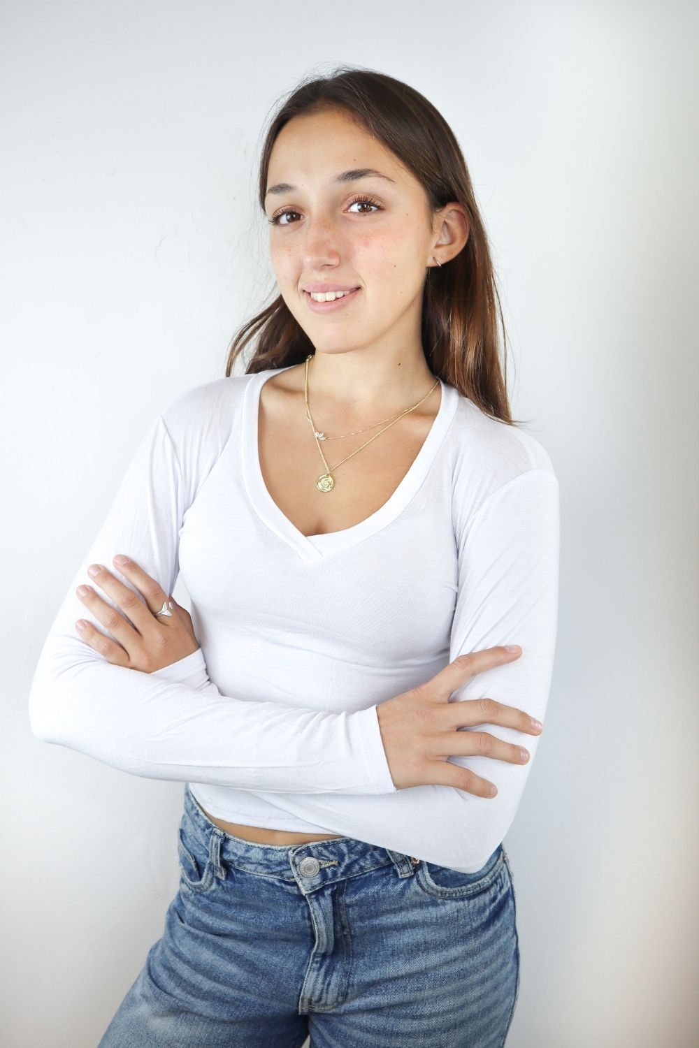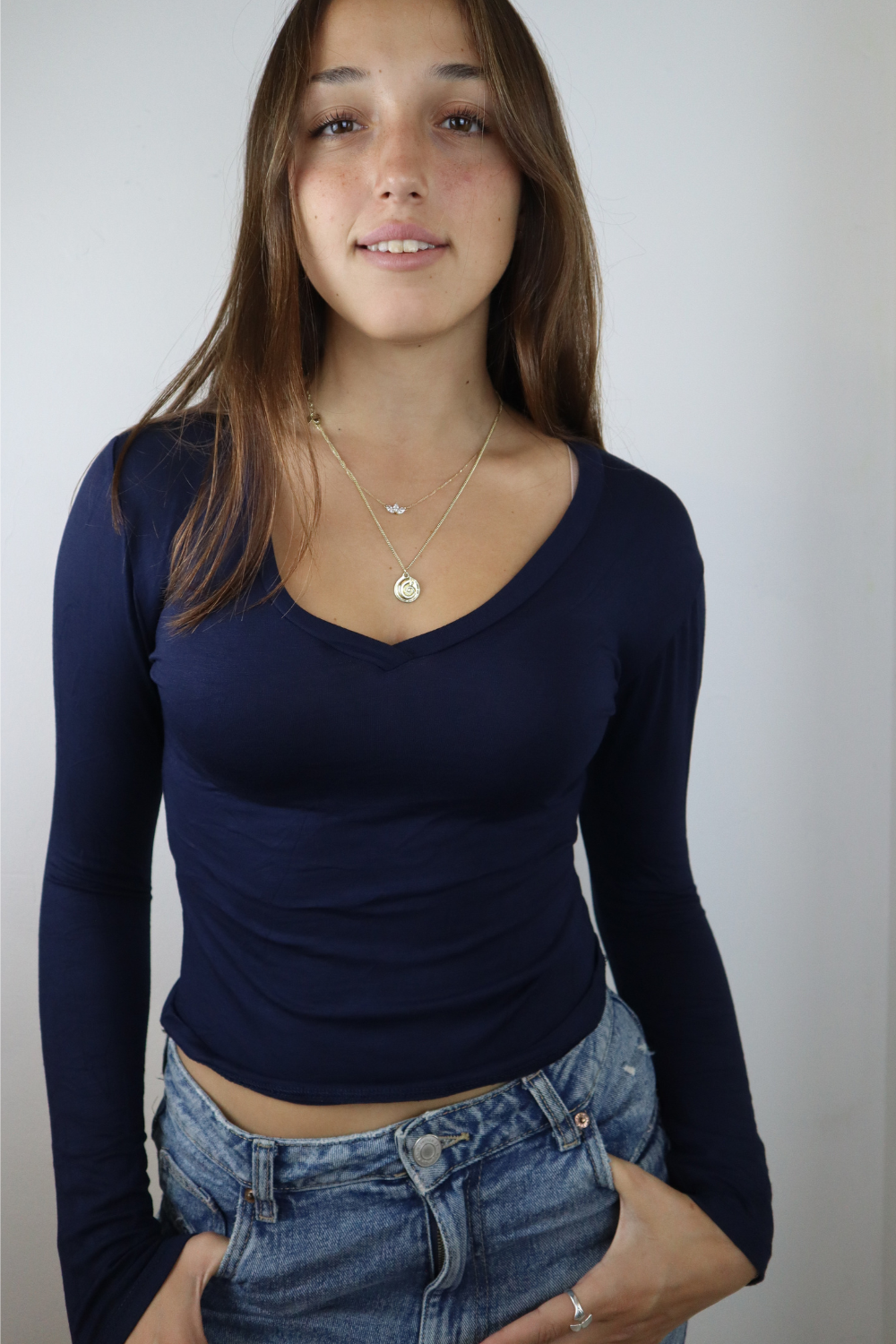 חולצת דגם וי תפר שרוול ארוך - קצרה במותן
