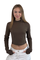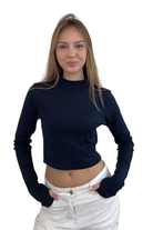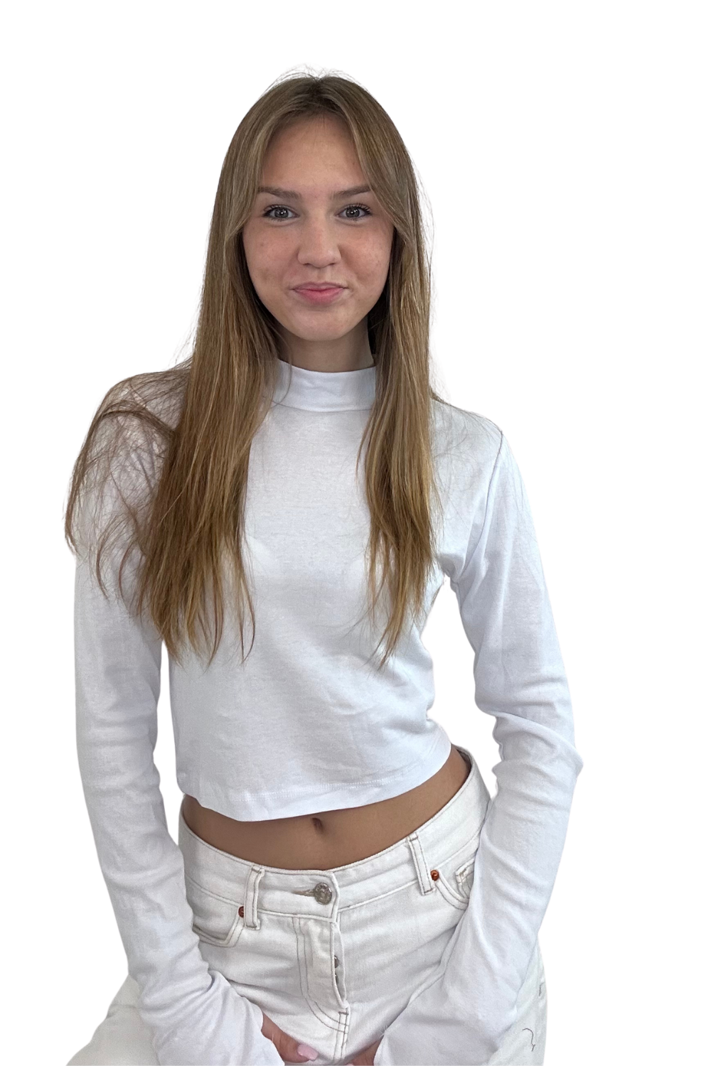 החולצה מגיעה בגזרת אורך בטן (קרופ) שמוסיפה טאצ' צעיר, אופנתי ורענן — מושלמת לשילוב עם מכנסיים או חצאיות בגזרה גבוהה.